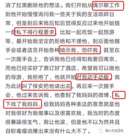 提私下行程的要求,握手会暗示恐吓,动手动脚到被请保安,还骚扰家人。