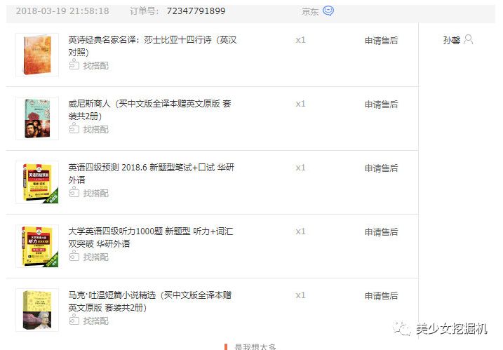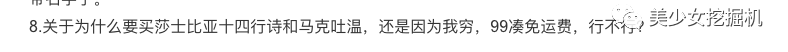 还回答了眼尖的粉丝的疑问,为什么给孙馨买四级材料的时候还买了莎士比亚和马克吐温?工具人自嘲:因为我穷,99凑免运费。