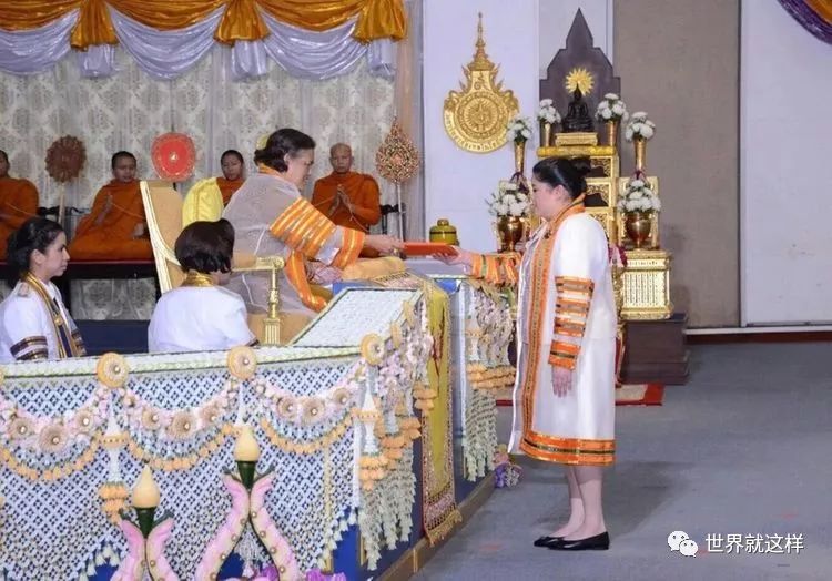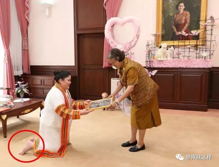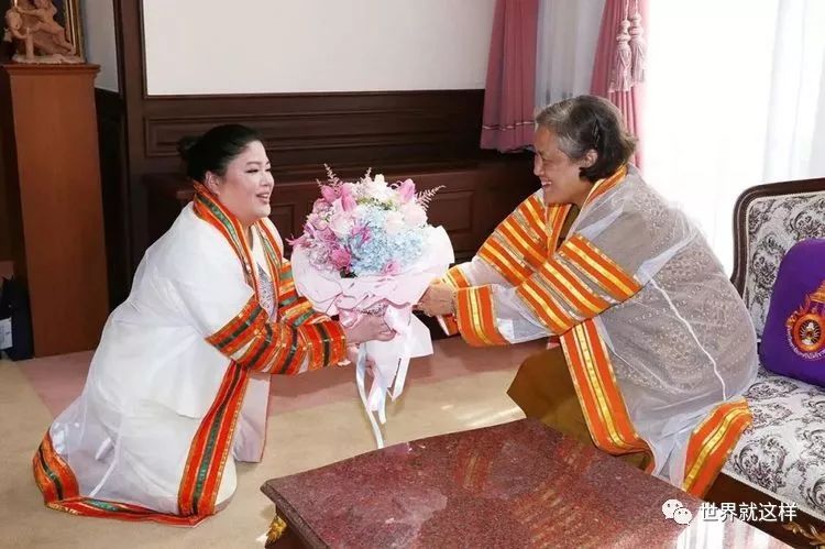 胖胖的小公主给诗琳通公主送上鲜花,她跪拜时的样子特别可爱,姨妈笑得合不拢嘴,赶紧接过侄女粉蓝色的花束。西里帕·朱他蓬公主是一个细心的孩子,她脱下鞋子,给姨妈诗琳通公主下跪,并送上了珍贵的礼物,蕙质兰心,就算发福了也很惊艳。