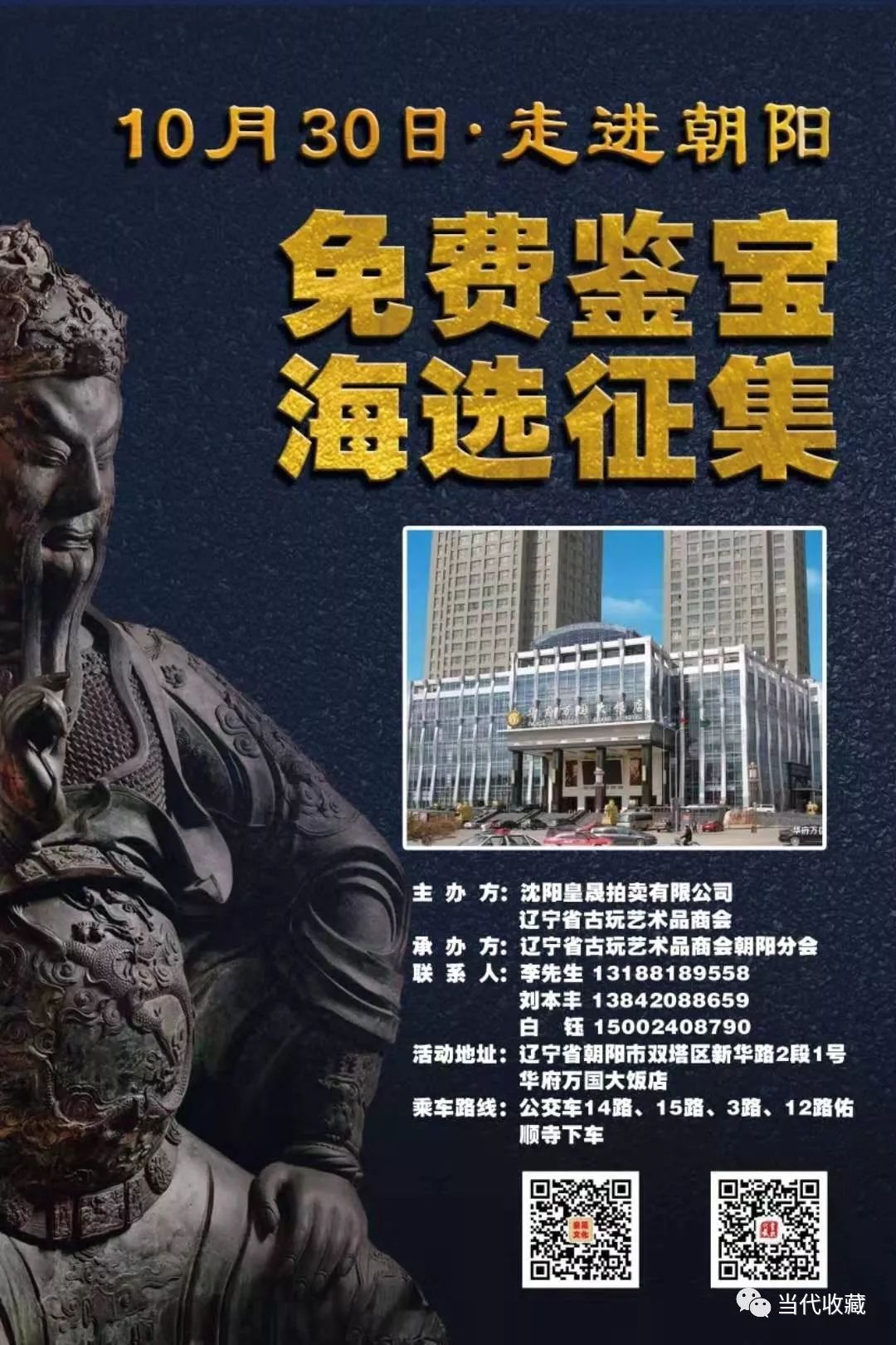 金秋10月, 秋高气爽,辽沈大地洋溢着丰收的气象。10月12日,沈阳皇晟拍卖携手辽宁省古玩艺术品商会走进朝阳华府万国大饭店,与朝阳广大藏友及古玩艺术品爱好者面对面,免费鉴宝、海选征集活动。 欢迎您的光临,品鉴盛世奇珍,共享文化盛宴!