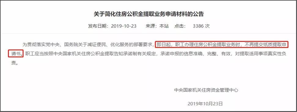 10月23日,中央国家机关住房资金管理中心官网发布《关于简化住房公积金提取业务申请材料的公告》