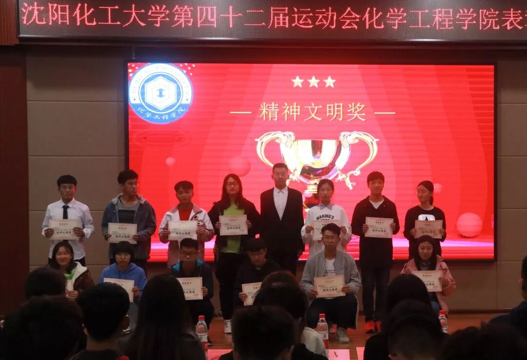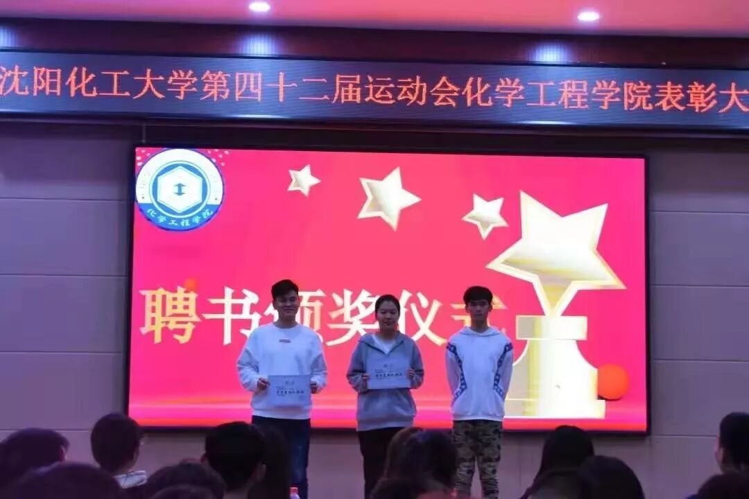2019年10月20日晚六点半,化学工程学院在青年之家举办了沈阳化工大学第四十二届运动会化学工程学院表彰大会。化学工程学院分团委学生会副书记王宇飞、学生会主席司江宁、纪委主任于晓君等大三成员作为本次活动的嘉宾惨加了本次大会。