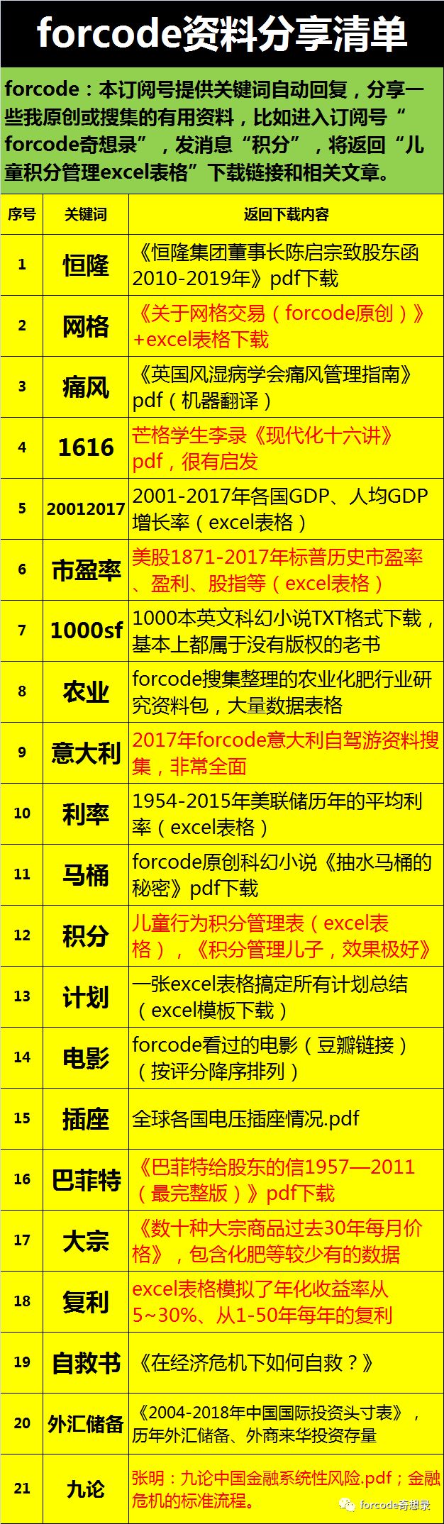 本订阅号也分享一些我原创或搜集的有用资料,比如进入订阅号“forcode奇想录”,发消息“积分”,将获得“儿童积分管理表(excel表格)”下载链接和相关文章。