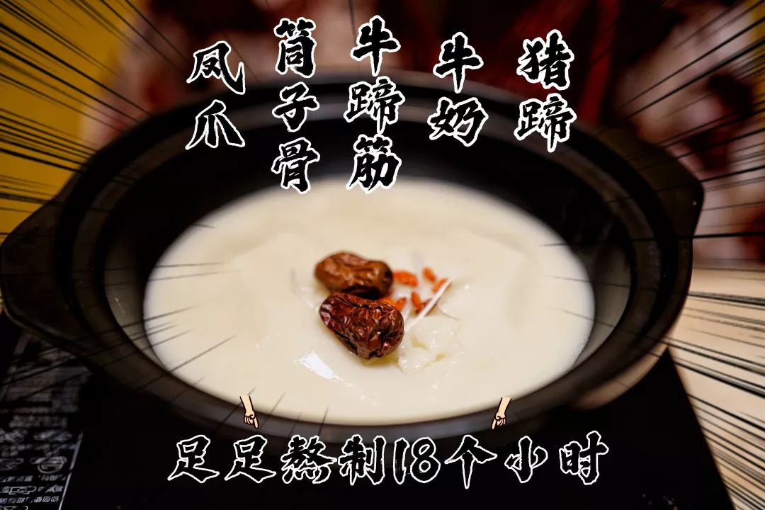 是由凤爪、筒子骨、牛蹄筋、牛奶、猪蹄等多种骨胶原小火足足熬制18个小时以上
