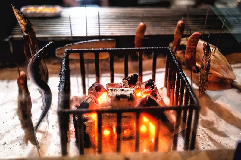 起源于仙台渔民的料理,中间是炭火,沙盘铺满周边,让料理物360°无死角被烤制,极具穿透力的热度能瞬间把水分锁住。