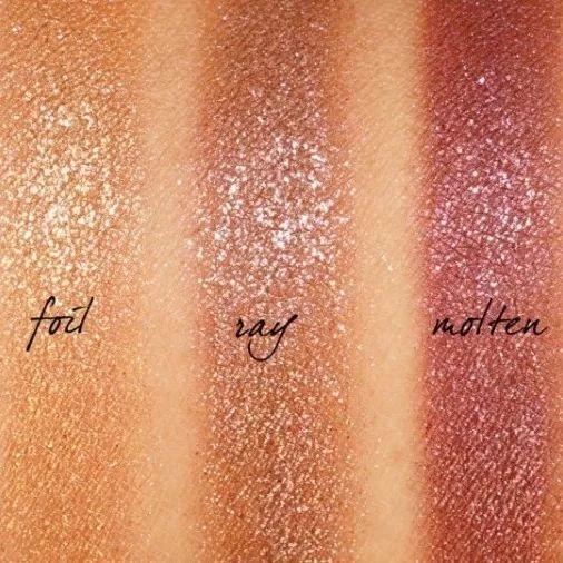 迷你三色眼影套组,#Foil金闪,#Ray闪亮的灰褐色,#Molten带闪梅子色,可单涂可叠加。
