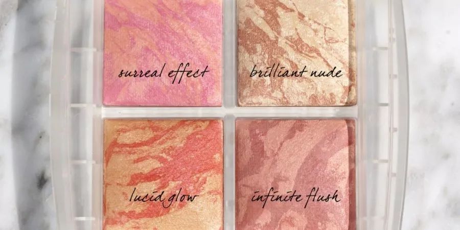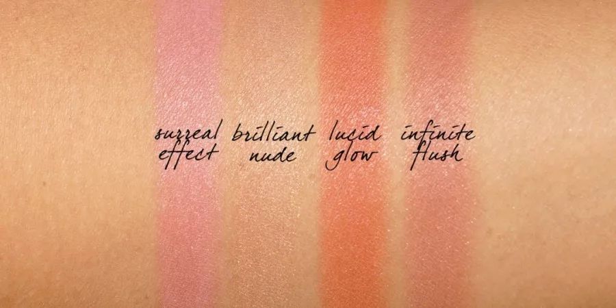 四色腮红盘的色号分别是:#Surreal Effect 洋粉色带柔和粉闪,#Brilliant Nude 带闪棕褐古铜香槟,#Lucid Glow 柔软金色光泽的珊瑚色,#Infinite Flush 紫红色调,每个色块都很日常百搭,真的是一盘在手,化遍春夏秋冬不同妆容。