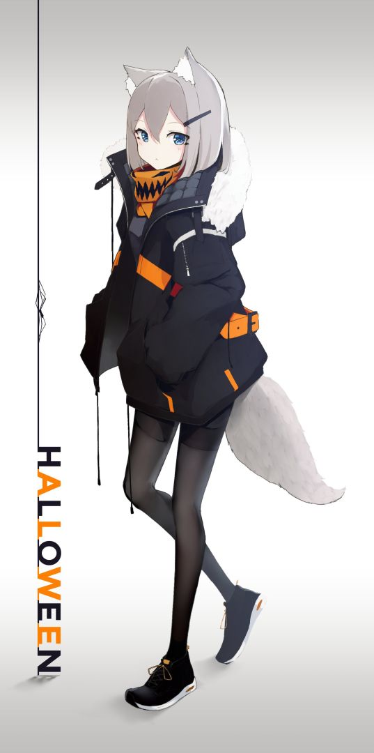 标签:原创作品/未知原创角色/未知窄图/手机壁纸全身图卡片/照片/海报样式万圣节简单背景站姿侧方视角动物特征银发/灰发短发直发蓝瞳大衣/夹克衫黑丝连裤袜腿部福利