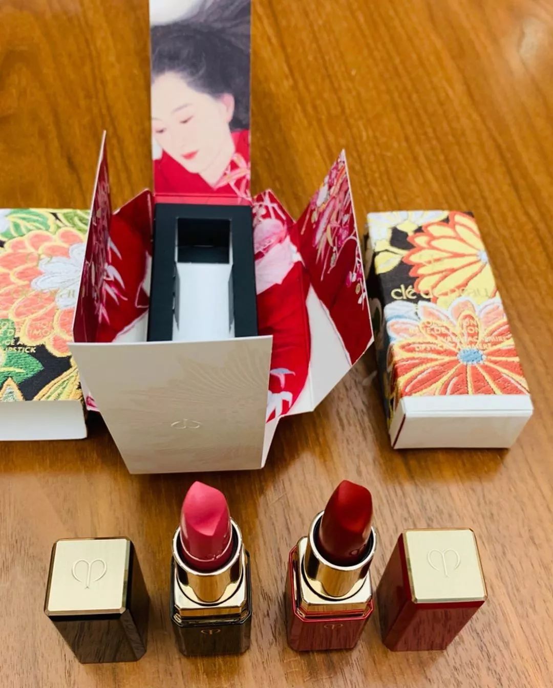 包装盒上印着的和服压纹摸上去非常有质感,就像一件艺术品。去掉外面的纸壳,就像解开一件和服一样,打开里面的白色纸盒,绘制的和服女性工笔画衬托着红色烤漆外表的口红展现在眼前,简直太美了。