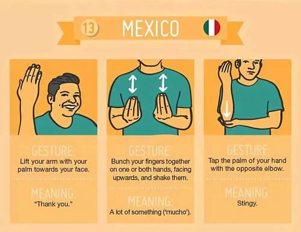 在墨西哥(Mexico),人们可以将手掌面对脸举在前面,来对人表示谢意。