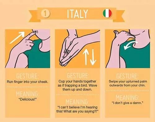 对他人表达称赞,是表达善意的体现。在各个国家,表示称赞的手势其实大不相同。在意大利(Italy),人们可以在用餐时用手抚摸脸颊来对厨师和服侍者表示称赞,像在说“哇,这个食物真美味呀。”