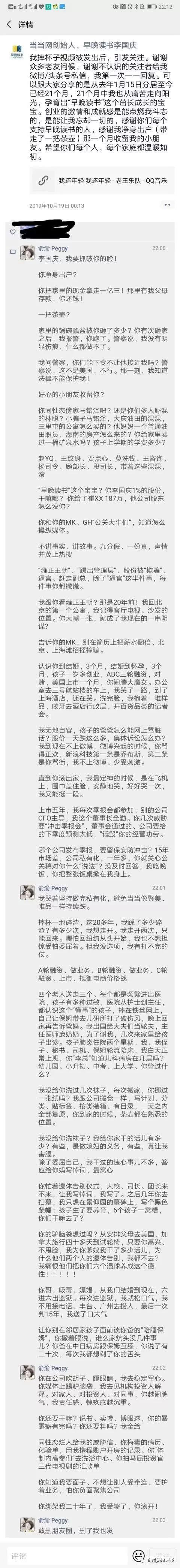 这个信息已经发了好几天,但网传的一段截图显示,俞渝突然在这条信息下面留言,俞渝显得非常的愤怒,用词是:“李国庆,我要撕破你的脸。”