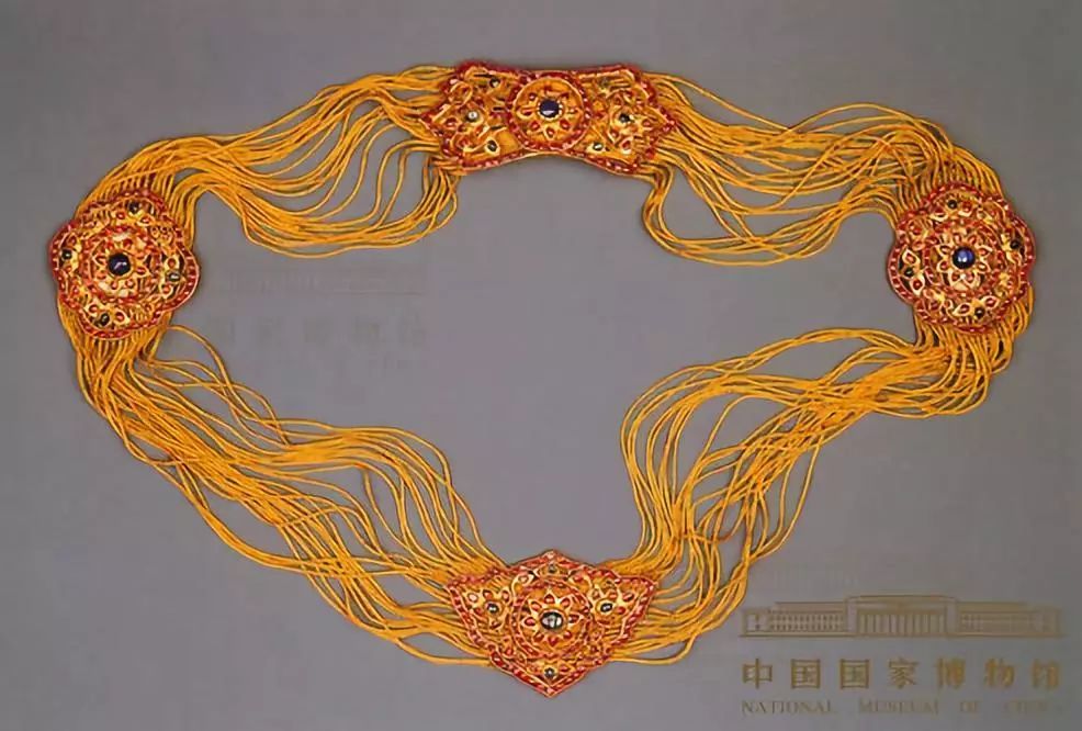 【金牌】清,周长115厘米。这块金牌是缅甸赠给乾隆皇帝的礼品。缅甸是中国邻邦,两千多年来,中缅两国有着密切的联系,乾隆十八年(公元1753年),缅甸国王派使臣带着大批礼物前来中国通好,受到清政府的隆重款待。随后因为战争,两国关系曾一度中断,但到乾隆末期以后,中缅两国关系走上了新的发展之路,两国的贸易活动也得到了开展。