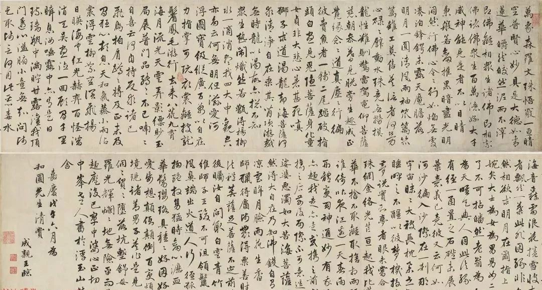 【成亲王行书临赵孟頫二十四赞】永瑆行书临赵孟頫书卷,纸本,纵35.2厘米,横248.5厘米,故宫博物院藏。永瑆书法于赵孟頫临习至勤,得益颇深。此书临赵孟頫之作,录中峰明本《(观音)大士三十二赞》中的二十四赞,用笔妍润隽逸,结体劲媚多姿,章法疏宕流畅,用墨枯润相间,通篇清丽典雅,具有赵书遗意。