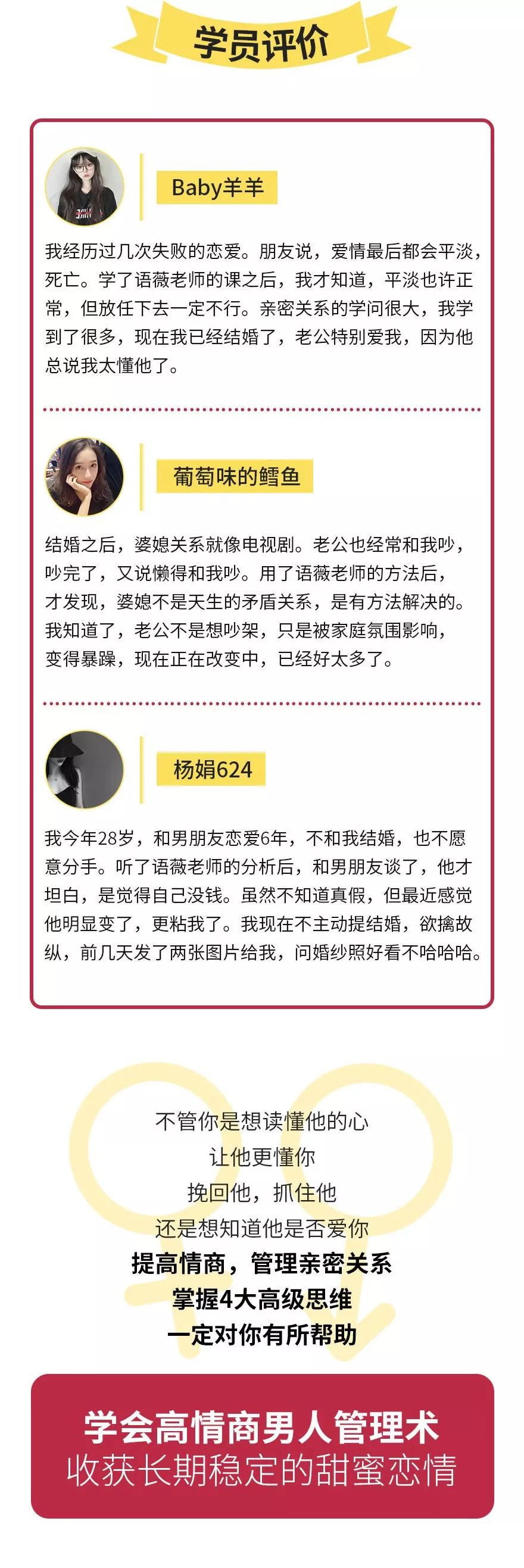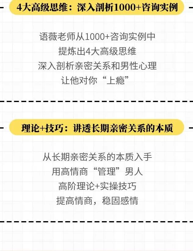 奖励回馈机制:管理的本质是提高效益,降低成本。对应“管理”男人,就是降低和男人的沟通成本,让他更懂我们,提高付出后的回报,让男人主动为我们付出。 管理亲密关系,维持长期稳定:亲密关系是动态的。也就是说,如果不去维护,亲密关系就会瓦解,如果只一味付出,关系的天平会严重倾斜,最终崩溃。 而如何管理亲密关系,维持长期稳定,这就是语薇老师在课程中的核心。 《用高情商“管理”男人,让他对你“上瘾”4大高级思维》?点击图片,进入课堂?