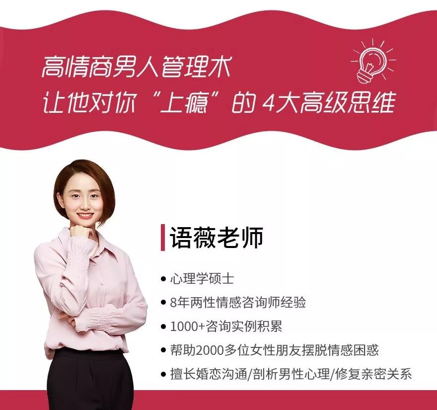 职场中,那些充满魅力的领导者,可以让员工甘心付出,公司危急时刻,就算没有工资,员工也能共同进退,甘心付出。其实,这就是管理的魅力。 语薇老师从这种充满魅力的管理思维中,提炼出核心方法。并结合1000+情感咨询案例经验,开发了高情商男人管理术课程。 让我们学会用高情商去“管理”男人,提升女性魅力,掌握亲密关系主动权,成为男人的领导者。 《用高情商“管理”男人,让他对你“上瘾”4大高级思维》?点击图片,进入课堂?