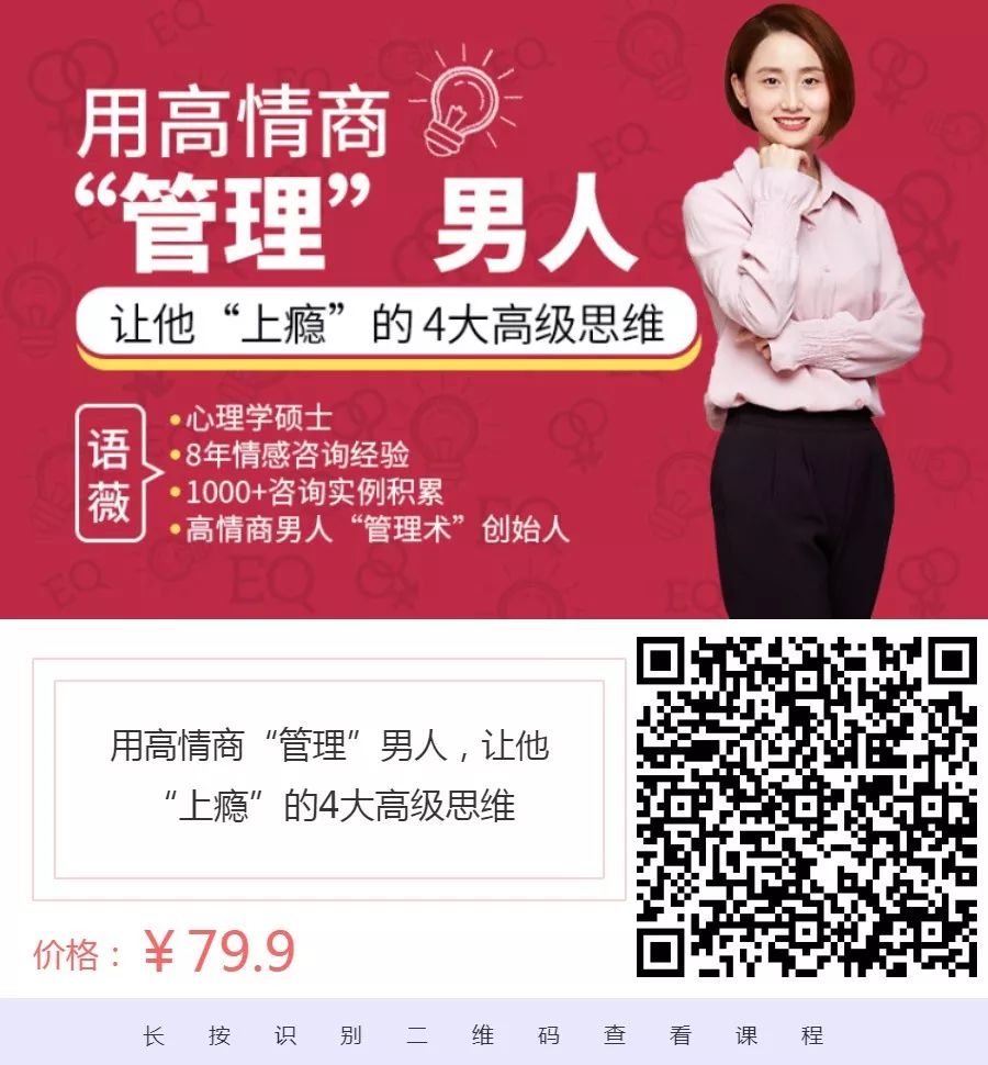 用高情商“管理”男人提升自身魅力让他对你“上瘾”掌握亲密关系主动权11节课学会4大高级思维课程原价399元现在特价79.9元不到一顿下午茶的价格,教你掌握一套终身有效的管理男人方法论