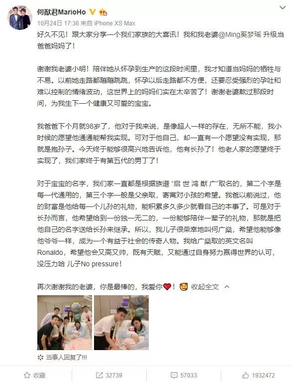 新升级当爸爸的何猷君看起来挺欣喜若狂的,激动的直接发了一篇小作文来分享自己的心情。