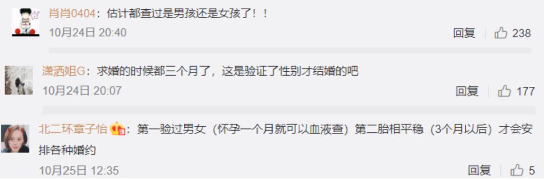 两人从求婚到结婚生子,前后不过五个月时间。对怀孕三缄其口,突如其来的求婚,再加上今天何猷君字里行间洋溢着的“马上就能多分到一份家产”的喜悦,就有人猜测,这估计不仅仅是奉子成婚这么简单,而是“早就查过了性别。”