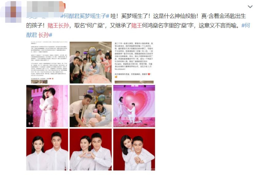 有人说因为何猷君的微博字字句句都在说长子长孙,还大张旗鼓的宣扬赐名字的事,仿佛最开心的事不是孩子的出生,而是他父亲终于有长孙了。