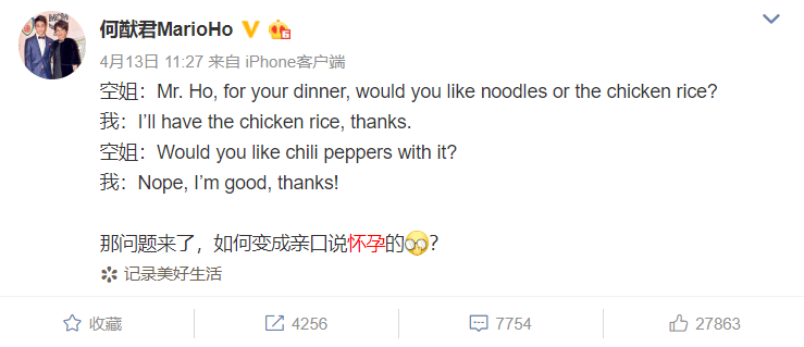 但何猷君立刻就在微博上否认,还还原了一段当时自己与空姐的对话,说只是在回答空姐自己想吃什么。