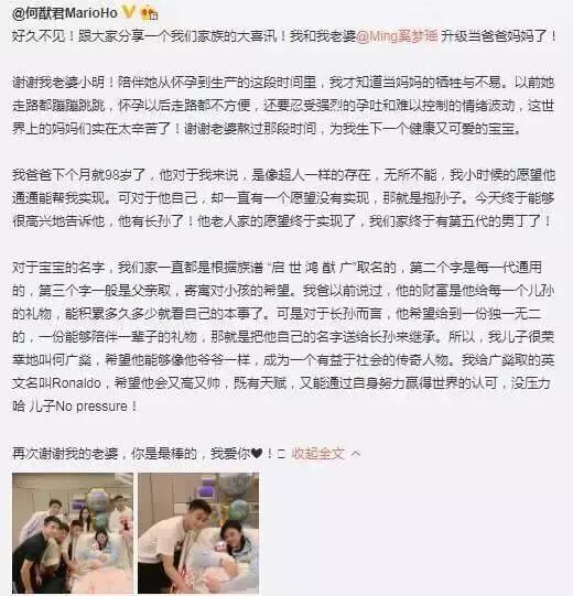 10月24日,和奚梦瑶迎来爱子的何猷君也难掩喜悦,发表长文宣布这一好消息,