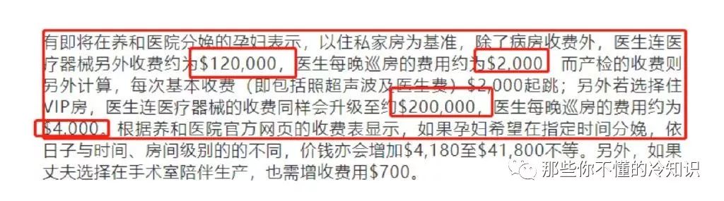 除了病房收费外,医院对于理疗器械以及巡房也都是单独收费。而VIP病房的收费则要更高,医疗器械20万港币,巡房每晚4千港币,指定时间分娩还需单加钱。另外,丈夫在手术室陪产也要额外收700港币,这医院估计也就富豪可以享受吧。