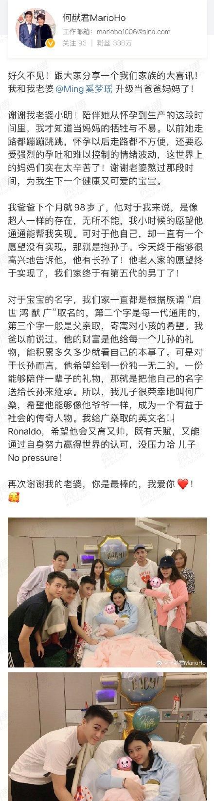 前一段时间,赌王儿子和奚梦瑶的梦幻婚礼一度成为大家热议的话题,现如今,他们两个人已经迅速升级成为爸爸妈妈,从两人的微博中可以看到,他们两个对于新生命的到来还是非常高兴的。并且更值得关注的是,他们的儿子是赌王的长孙,这在一个大家族中可以非常重要的,更何况是这样的豪门世家。