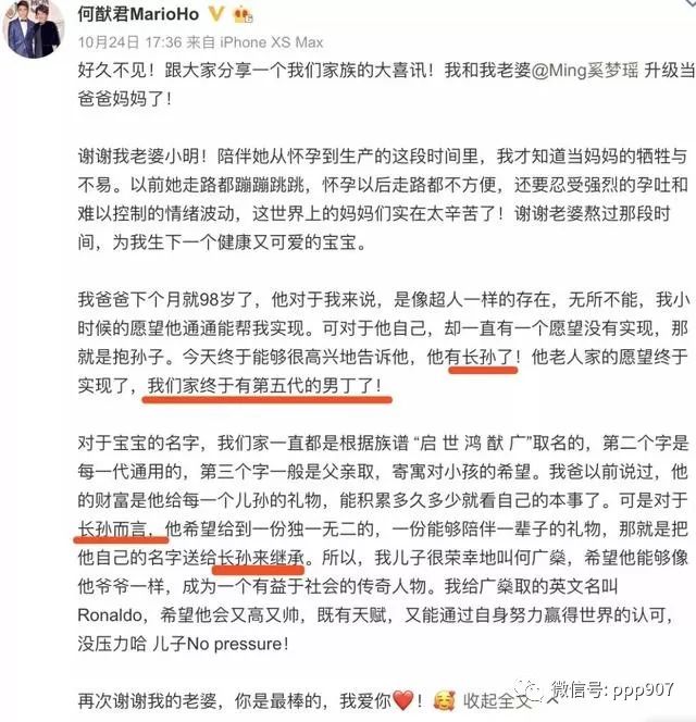 前天,何猷君发文宣布奚梦瑶产下赌王长孙“何广燊”,声称这个名字是赌王何鸿燊亲自取的,还说这个是“第五代男丁”。