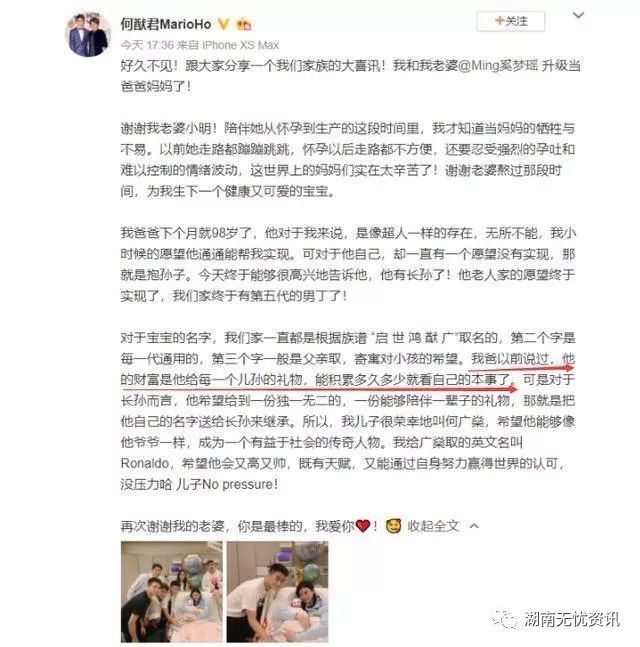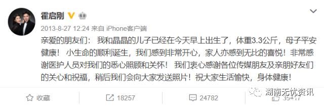 官宣之后的霍启刚就退出了这个社交平台,据说是在医院照顾刚刚生产的妻子,几天后才又在微博上晒出一家三口的温馨照片,此时我们看到,虽然也是刚生产不久的郭晶晶状态很好,面色红润有光泽,一看就是被照顾得非常好,这两点或许才是何猷君受争议的主要原因。但是作为新生父亲再加上儿子是自己家族的长子,这一连贯带来的“甜蜜暴击”,想要马上秀出自己的喜悦也没有什么错,难道喜事也要挑时间公布吗?相信在极度兴奋的节点上也很难控制住吧。