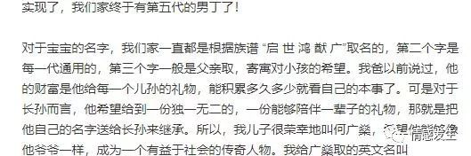 何猷君透露,爸爸何鸿燊说自己的财富是每一个儿孙的,但是希望把自己的名字给长孙继承,所以何猷君的孩子名字叫做何广燊,继承了何鸿的“燊”字。