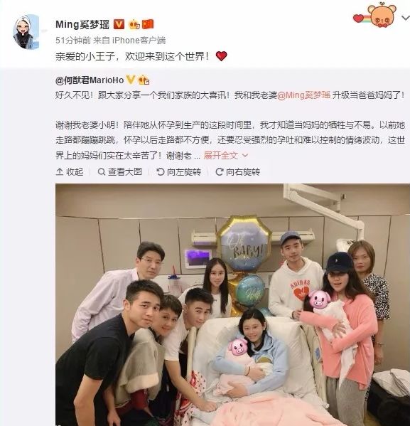 何猷君在微博宣布奚梦瑶生子喜讯,并写道:“好久不见!跟大家分享一个我们家族的大喜讯!我和我老婆@Ming奚梦瑶 升级当爸爸妈妈了!”