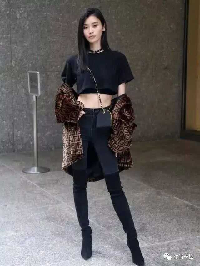 黑色的短款上衣配着紧身的黑长裤,这腿,这腰简直让人羡慕,尤其是诠释了什么叫做腿长一米八的即视感,又细又长。