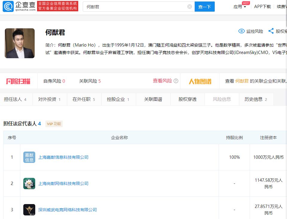 如果四房再不拼出个男孩,何猷君所在的四房可能得吃大亏。企查查数据显示,何猷君在内地的产业多和家族产业并没有关系,到底是不靠家里自己创业还是真没有分到手,谁也不知道。