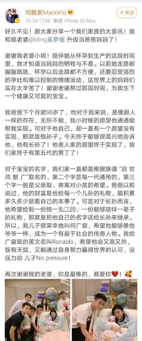 奚梦瑶产子了!10月24日,何猷君宣布奚梦瑶产下一子,并公布了孩子的名字“何广燊”,英文名叫“Ronaldo”。