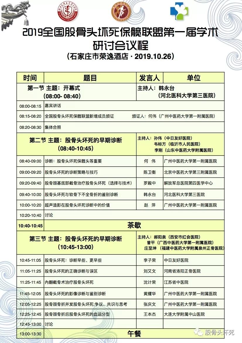 2019年10月25-26日在河北省石家庄胜利召开全国保髋联盟第一届学术会议,由河北医科大学第三医院承办,广州中医药大学第一附属医院协办。 感谢河北三院韩永台主任团队周到的安排和热情接待!感谢广州中医药大学一附院何伟院长及团队对保髋事业做出的不懈努力!让大家相聚在美丽的石家庄,交流学术、切磋技艺,分享成果,为促进骨坏死诊疗水平的提高相互学习!