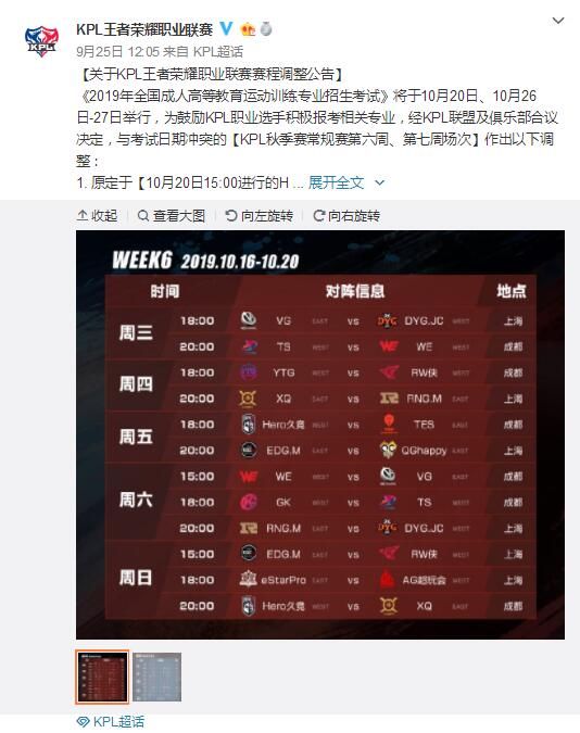KPL官方公布的赛程调整 15名选手报考广州体育学院 选手重回校园计划落地 今年6月,腾讯电竞在全球电竞运动领袖峰会上曾公布了电竞奖学金计划,其中重要的一部分就是和北京邮电大学以及广州体育学院达成合作,电竞选手通过考试后即可入学就读,接受高等教育。 KPL联盟调整比赛时间的消息发出后,相关的俱乐部也主动公布了自家参考选手,其中15名报考广州体育学院的选手浮出水面:Hero久竞的久诚、尘夏、最初和久安;GK的支配;XQ的情浪;YTG的落幕和一天;EDG.M的无痕;VG的兜兜;QGhappy的770、Fly、Mojo和Ggod甚至教练SK也将参加考试。