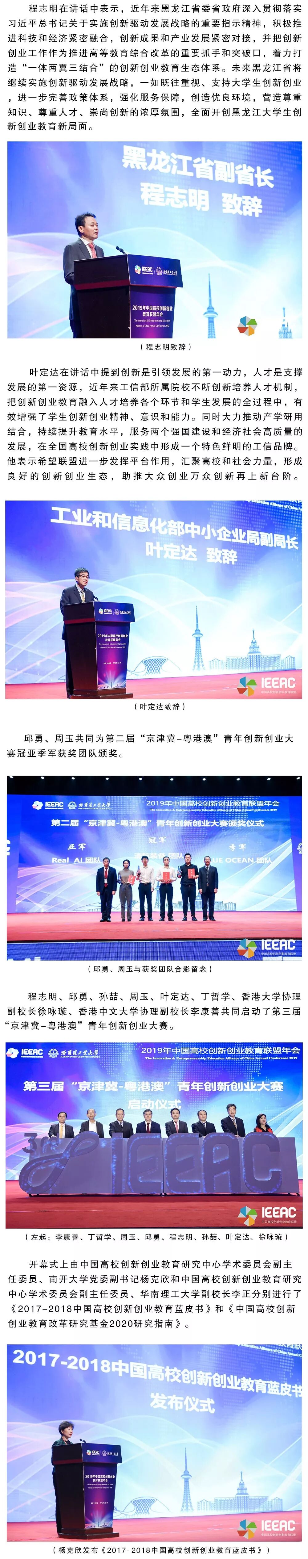 2019年10月20日上午,由中国高校创新创业教育联盟主办、哈尔滨工业大学承办的2019年中国高校创新创业教育联盟年会在哈尔滨市开幕。黑龙江省副省长程志明,中国高校创新创业教育联盟理事长、清华大学校长邱勇,哈尔滨市市长孙喆,哈尔滨工业大学校长周玉,工业和信息化部中小企业局副局长叶定业,黑龙江省教育厅副巡视员丁哲等出席开幕式。创业学院副院长(挂职)高伟代表学校参加本次年会,并在年会上获理事单位授牌,我校正式加入中国高校创新创业教育联盟。