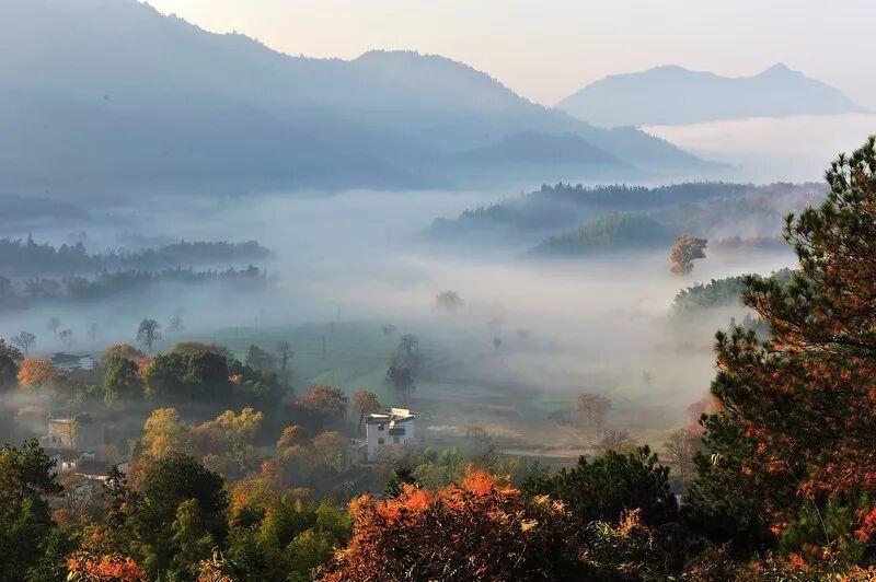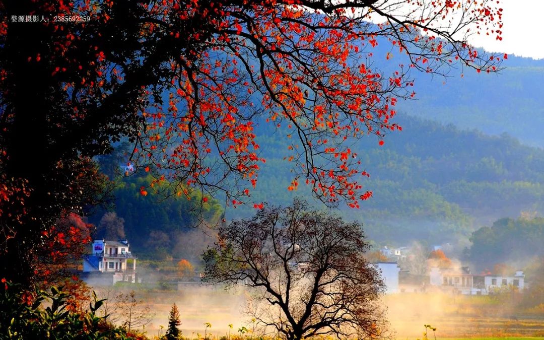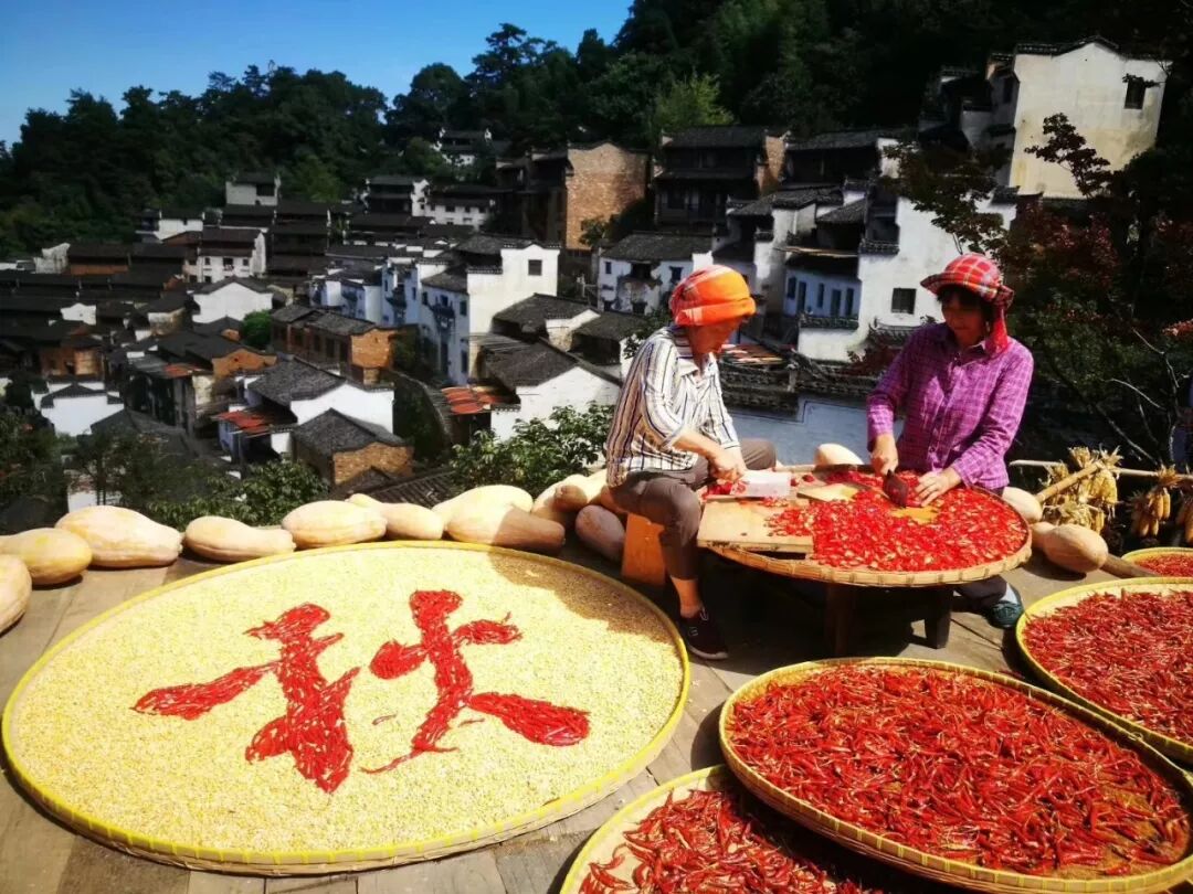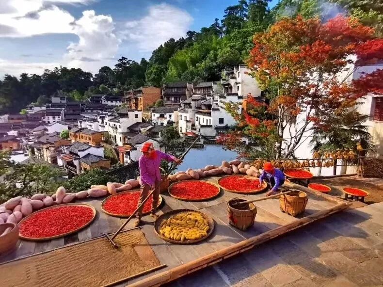 山水渲染,蒙黄色、朴色、艳红色、丰收的笑靥、环山涧水的徽派古村落与这些色调相若,勾勒成一张张天人合一的画卷,勾勒成秋天的绚丽多彩,这就是让人们心醉的婺源。