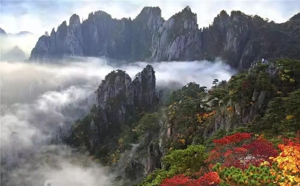 黄山的秋季,别有种种胜景。秋高气清,白云碧汉,丹枫似火,草深果黄。明代大旅行家徐霞客也因此赞赏黄山秋景:枫林相间,五色纷披,灿若图绣。黄山的秋天,还因为林茂色鲜,鸟语花香,生气盎然。竟是秋天里的春天。令常见的悲秋之情为之一扫。