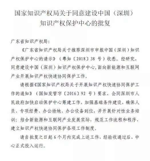 获得国家知识产权局批复后,深圳市市场和质量监管委将会同相关单位加快保护中心的筹建工作,确保2018年11月30日完成保护中心场地建设并通过国家知识产权局验收,确保2018年12月25日挂牌运作。