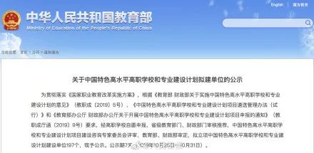 25日,教育部、财政部公示了中国特色高水平高职学校和专业建设计划拟建设单位名单。其中,197所拟建单位覆盖29省份,布点最多的五个专业大类分别是装备制造类、交通运输类、电子信息类、财经商贸类、农林牧渔类。(人民日报)