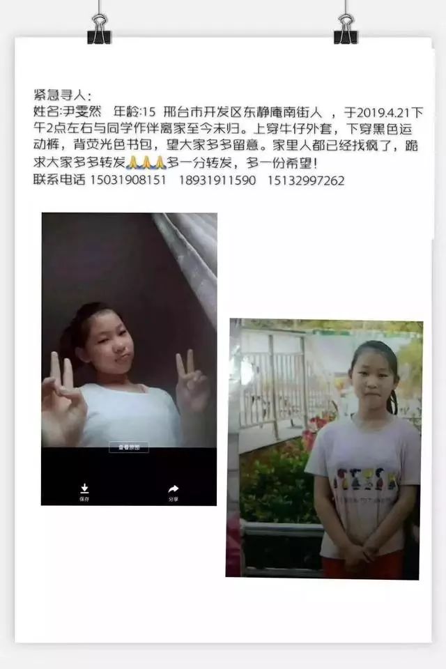 微信朋友圈发布的寻人启事“昨天(22日)有人告诉我们,在石家庄的火车站见过俩孩子,其中一个像是我妹妹,我就赶来了,目前还在石家庄寻找。”尹先生说,目前,他和五个朋友正在石家庄市区内开车寻找尹雯冉的下落。尹先生告诉记者,尹雯冉是跟同学左金莹一同失联的。“我们目前还是不确定她现在在哪儿。”尹先生向记者说道。此外,尹先生表示,4月23日上午,有好心出租车司机给他们发来视频,视频显示,邢台市区也出现了两个孩子的身影,两人当时上了从邢台去往邯郸的长途车。经过尹先生的父亲初步确定,好心出租车司机提供的视频里应该就是走失的两个孩子。下一步,尹先生一家将分别在石家庄和邯郸进一步寻找。重要提示尹雯冉,15岁,是邢台市开发区东静庵南街人,于2019年4月21日14时许,与同学作伴离家至今未归。上穿牛仔外套,下穿黑色运动裤,背荧光色书包。大家若有两个孩子的线索,请及时联系尹雯冉的哥哥:尹先生15132997262,或者拨打河北青年报热线电话0311-83830000。望好心人多多留意,积极ZHUAN发扩散寻人!注:本文转载自网络,不代表本公众号立场,仅供读者参考,著作权属归原创者所有。我们分享此文出于传播更多资讯之目的。如有侵权,请在后台留言联系我们进行删除,谢谢!
