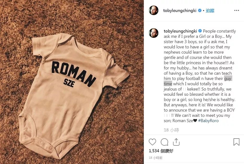 Toby在IG上载了一张男B仔衫,并发文指,自陀B后,好多人经常问她喜欢仔定女。她就希望是囡囡,皆因自己姐姐已经有3个男孩,若果生女,3个侄仔可以变得更温柔,并令自己的囡囡成为家中的小公主。不过,她老公就喜欢男仔:「我老公一直梦想望有个仔,因他可以教囝囝踢足球和拥有属于他们的『男人时间』」。不过无论是仔定女,最紧要就是BB健康。最后Toby就宣布BB性别:「我们将会有一个仔,我们已经急不及待想见,Roman Sze。」Toby亦为Roman开了一个IG账户,望记录Roman的成长过程。