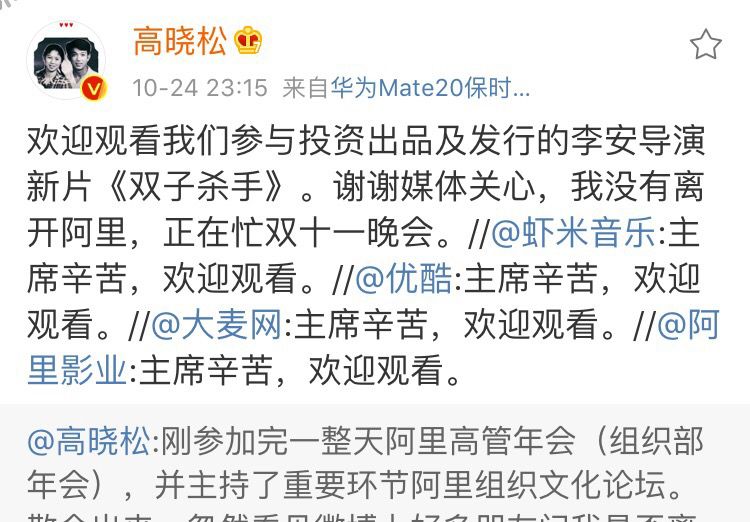 今年二月,高晓松在微博如此声明。猝不及防的是,据天眼查数据显示,10月21日,高晓松正式卸任北京阿里巴巴音乐科技有限公司董事长、法定代表人,由阿里巴巴创新业务事业群总裁朱顺炎接任。随后,阿里对以上职位变动回应称,属于正常的公司高管任职调整。目前高晓松仍持有北京阿里音乐的股权,只是变成了该公司的自然人股东和董事。