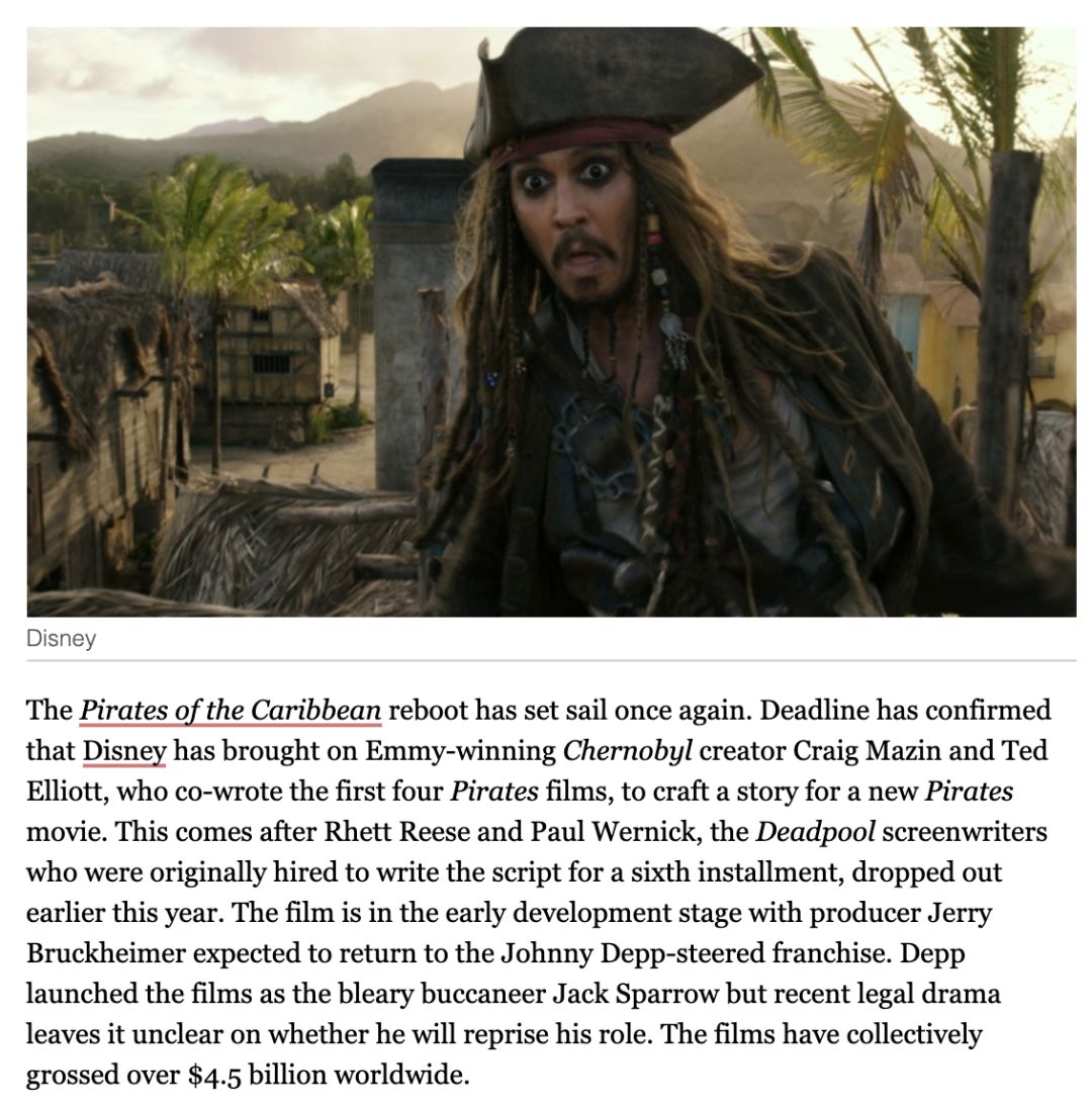曾被曝可能完结的《加勒比海盗》再度起航,该系列的重启新片在停滞半年后换人重新开始运作了:迪士尼找来《切尔诺贝利》主创Craig Mazin和前四部《加勒比》电影编剧Ted Elliott,为《加勒比海盗》重启版开发新故事。此前迪士尼宣布重启《加勒比海盗》,将拍新片,但不再由约翰尼·德普主演,编剧定为《死侍》编剧组合Rhett Reese和Paul Wernick。(刺猬公社)