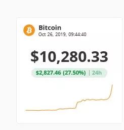 交易平台Coinbase报价显示,比特币突破10000美元整数大关,刷新逾一个月新高,24小时涨幅逾30%。