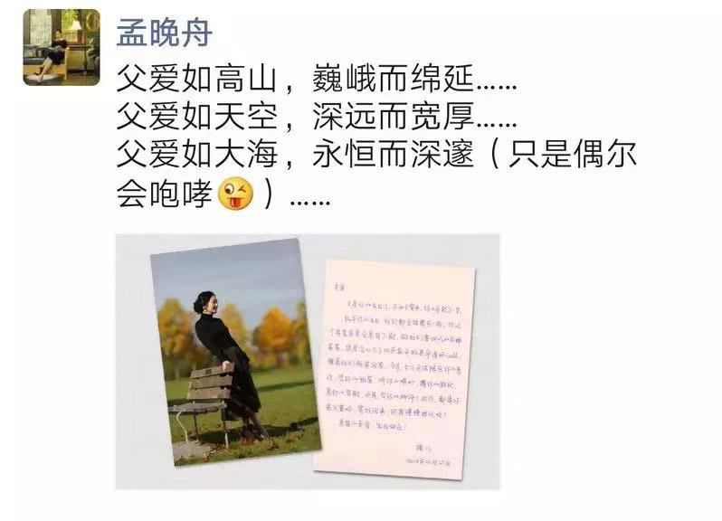 【任正非75岁生日,孟晚舟发朋友圈:等我回来】10月25日,华为首席财务官孟晚舟在朋友圈祝父亲任正非生日快乐,并表示“父爱如高山,巍峨而绵延;父爱如天空,深远而宽厚;父爱如大海,永恒而深邃(只是偶尔会咆哮)”。在朋友圈中,孟晚舟附上自己的亲笔信,称往年任正非生日都会催促家人回家,今年无法陪伴,希望等她回来再还。(新京报)