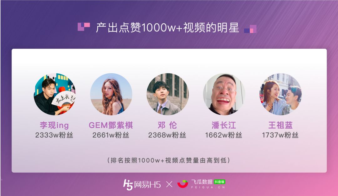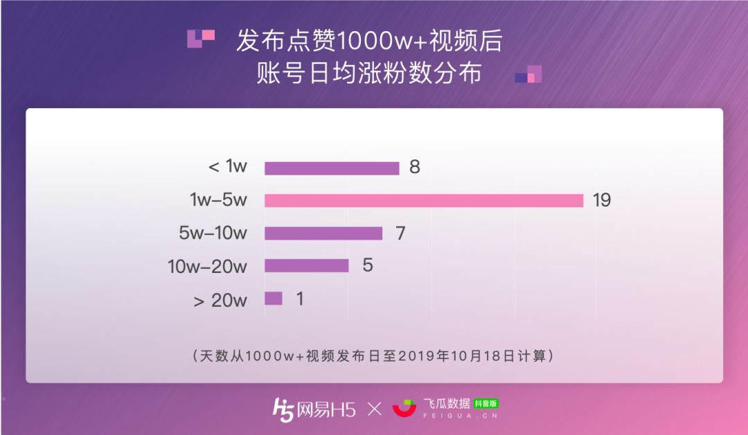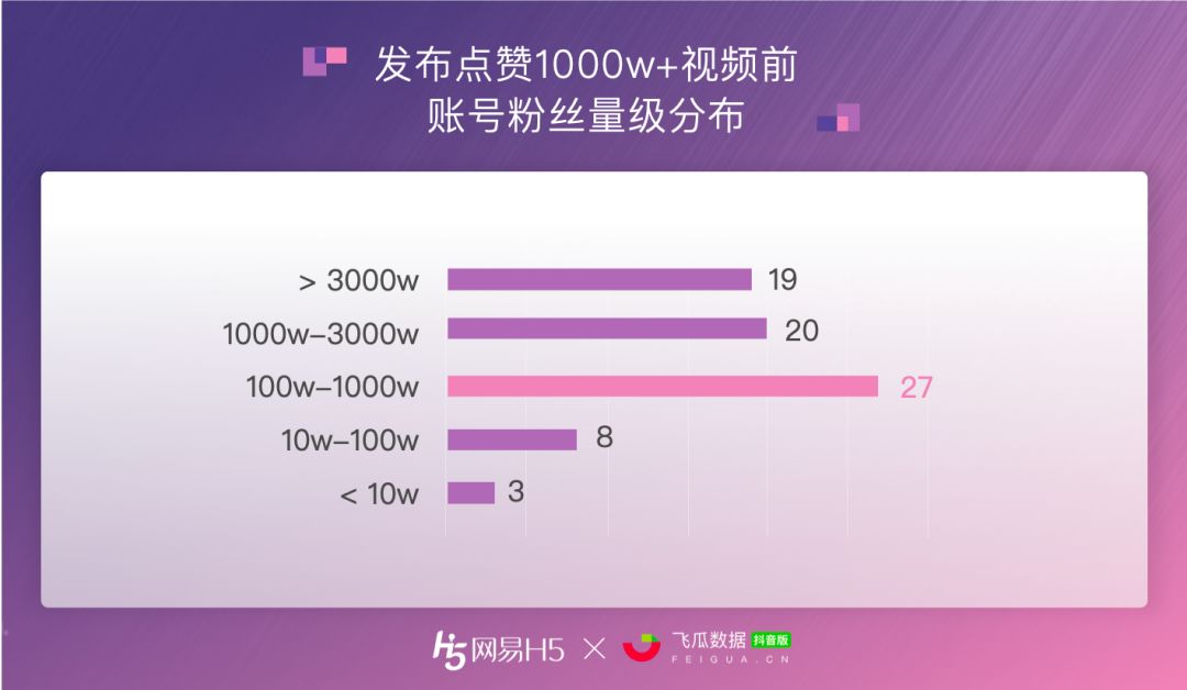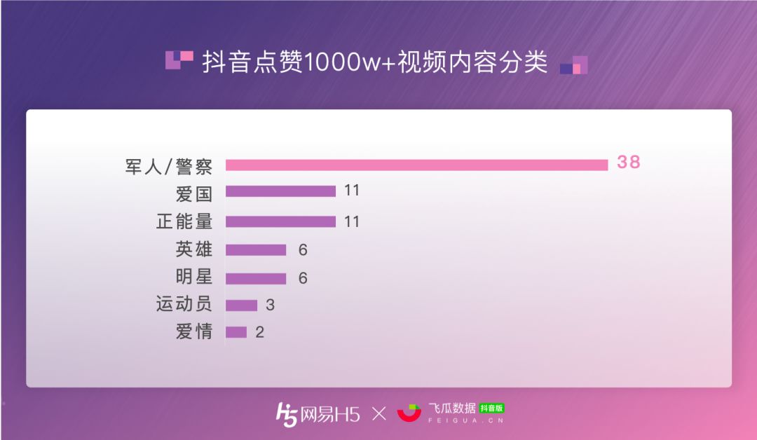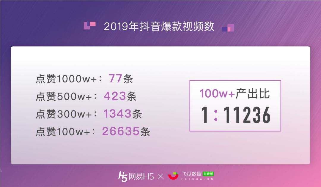 抖音的推荐视频由算法分发,一条视频能获得的曝光量,主要由一定条件下用户的停留时间和点赞、评论、转发数决定。 普通人发一条视频可能只有几个赞,而有些播主却能收获几万、几十万,甚至成百上千万的点赞。 一条视频能否成为“爆款”,其影响因素有很多。即使是同一条视频,发送的时间、地点、账号不同,都有可能得到不同的数据结果。 但同时,我们也能从大量的爆款视频中分析出共性和规律,从宏观的角度看待短视频的发展。 那么,抖音点赞最多的短视频到底什么样?抖音上最有流量的人究竟是谁? 网易H5联合飞瓜数据,对2019年抖音上点赞量超1000w的视频进行了统计和分析。相信这份报告能够解答你关于爆款视频数据的所有疑问,也许会颠覆你的认知。