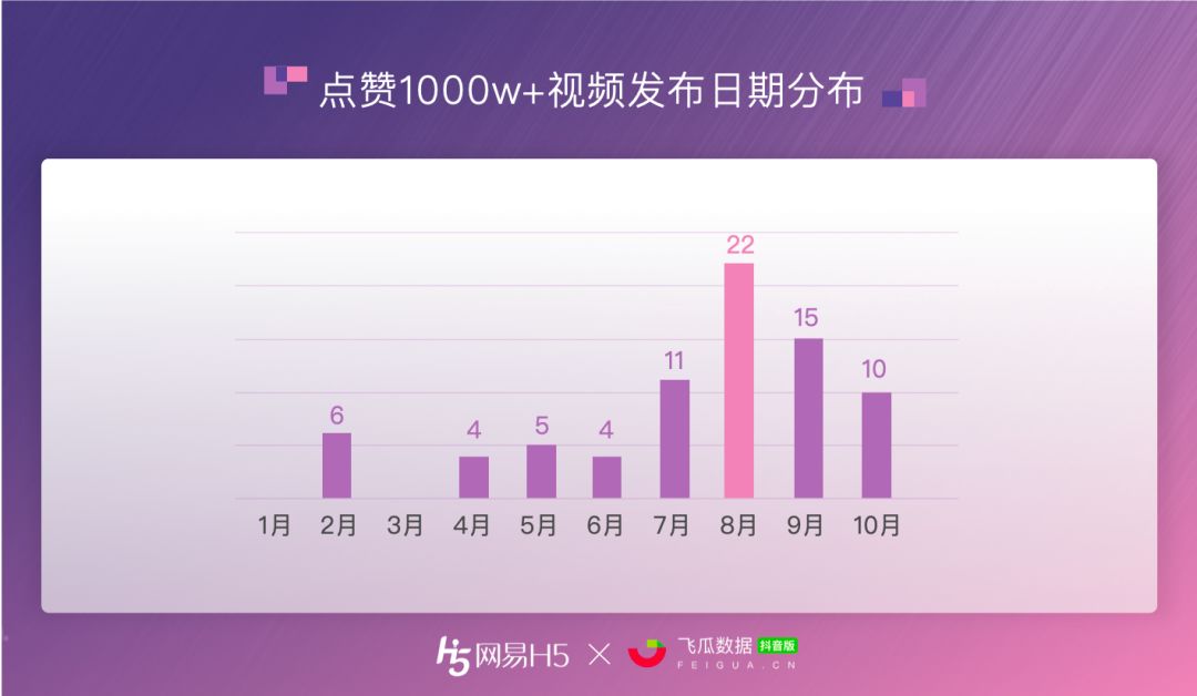 今年点赞1000w+的视频集中在下半年,其中8月的视频数量最多,有22条。其中6条为香港相关内容。
